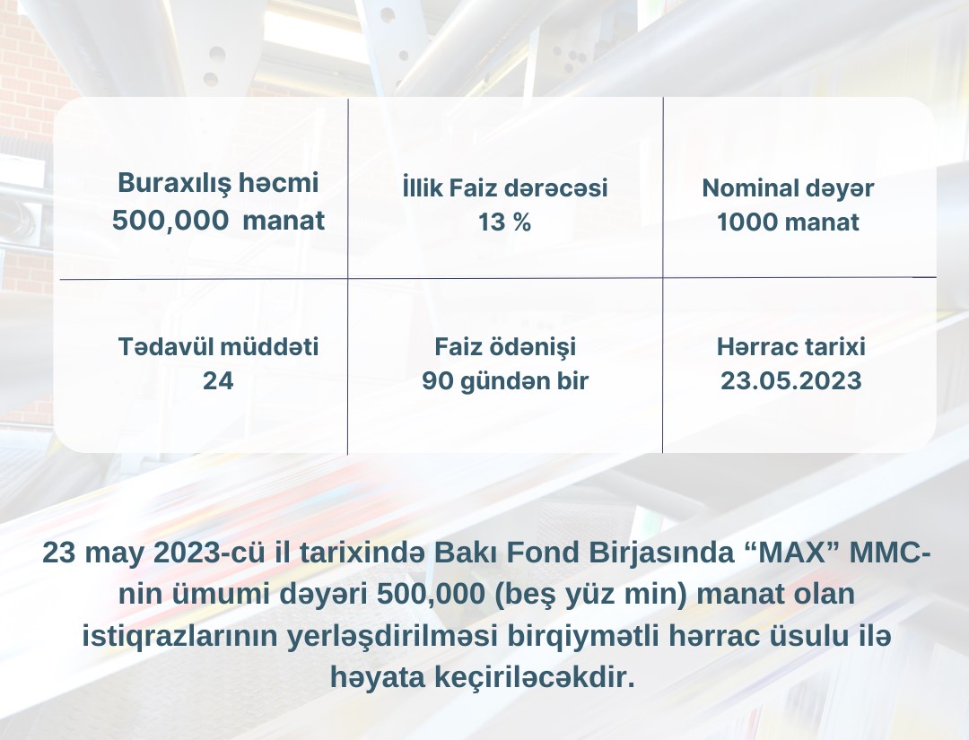 17 may 2023-cü il tarixində Bakı Fond Birjasının (BFB) Listinq Komitəsinin qərarı ilə “MAX” MMC-nin ümumi dəyəri 500 min manat olan istiqrazları standart bazar seqmentində listinqə daxil edilib.