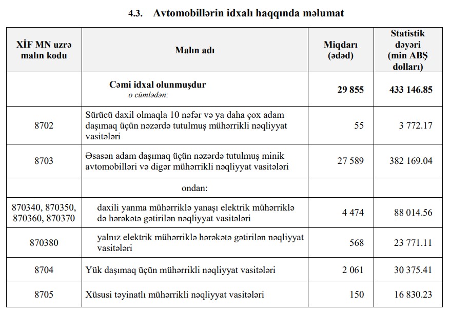 2023-cü ilin ilk 4 ayında Azərbaycana 23 milyon 771 min dollar dəyərində 568 ədəd yalnız elektrik mühərriklə hərəkətə gətirilən nəqliyyat vasitələri (elektromobil) idxal edilib. 2022-ci ilin ilk 4 ayında Azərbaycana 2 milyon 920 min dollar dəyərində 92 ədəd elektromobil idxal edilmişdi.