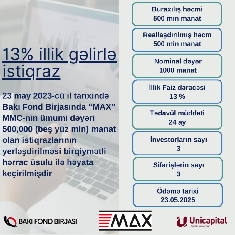 23 may 2023-cü il tarixində Bakı Fond Birjasında “MAX” MMC-nin tədavül müddəti 24 ay, nominal dəyəri 1000 manat olan AZ2001025447 dövlət qeydiyyat nömrəli, 500 min manat həcmində olan, faizli, təmin edilməmiş sənədsiz, adlı istiqrazlarının yerləşdirilməsi üzrə hərrac yekunlaşıb.