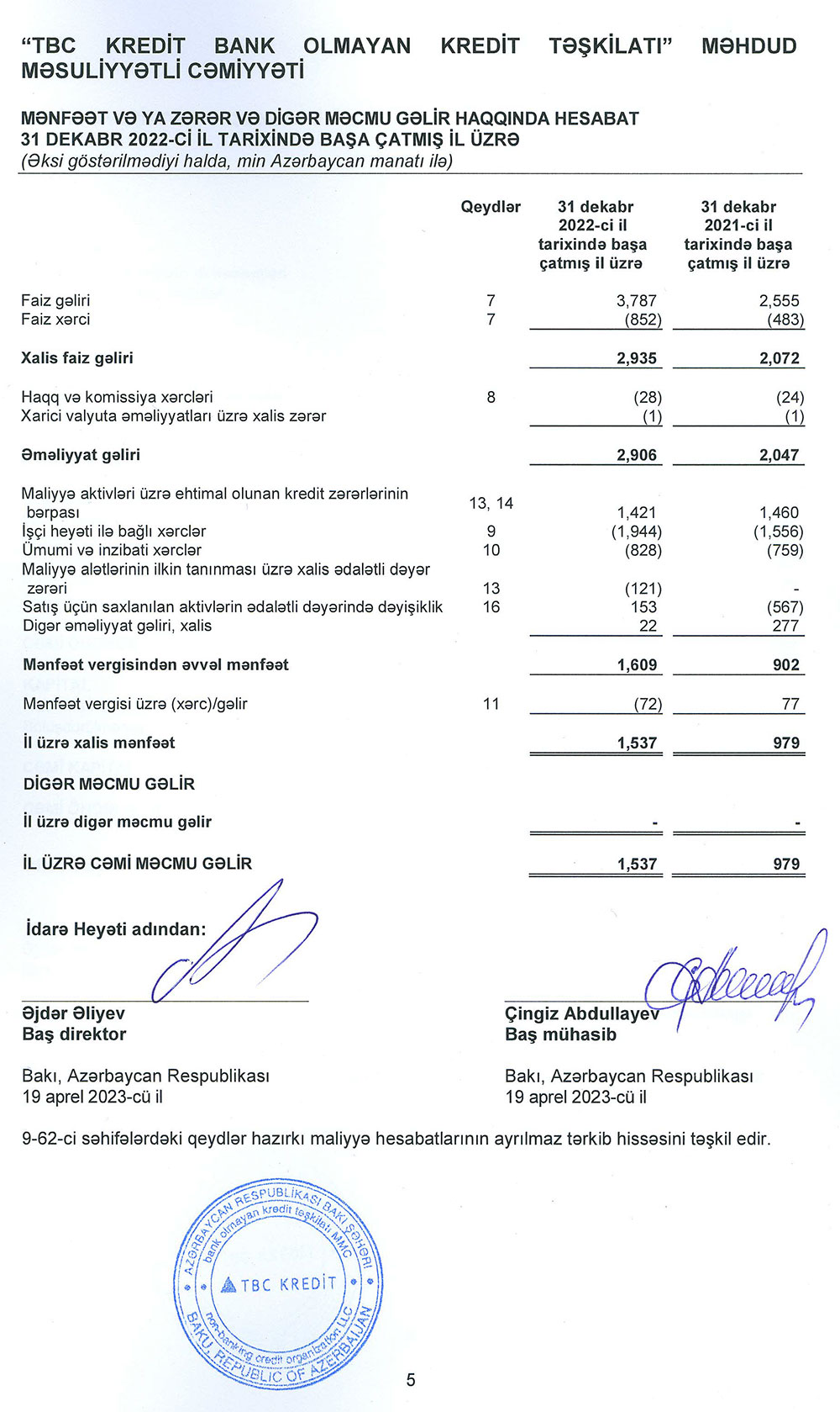 "TBC Kredit Bank Olmayan Kredit Təşkilatı" MMC-nin 31 dekabr 2022-ci il tarixində başa çatmış il üzrə Maliyyə Hesabatlarının Beynəlxalq Standartlarına uyğun hazırlanmış Maliyyə Hesabatları.“TBC Kredit BOKT” MMC 2022-ci ili 1 milyon 537 min manat xalis mənfəət ilə başa vurub. BOKT 2021-ci ili 979 min manat xalis mənfəət ilə bağlamışdı. Beləliklə, “TBC Kredit BOKT” MMC in xalis mənfəəti 2022-ci ildə 2021-ci illə müqayisədə 1,6 dəfə artıb.