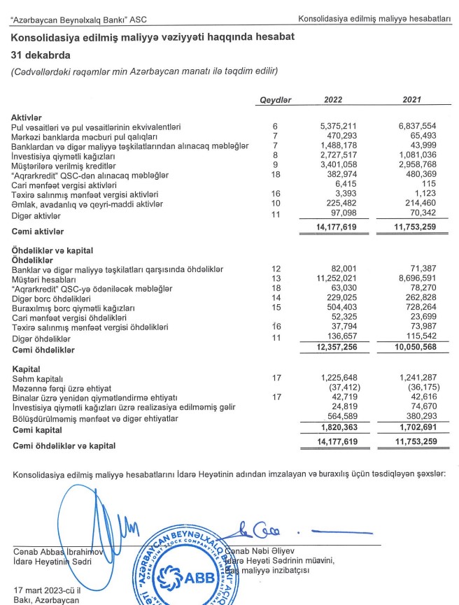 ABB qrupu 31 dekabr 2022-ci il tarixində başa çatan il üzrə müstəqil auditorun hesabatı ilə birlikdə konsolidasiya edilmiş maliyyə hesabatlarını dərc edib. Maliyyə hesabatlarındakı göstəricilərə “Azərbaycan Beynəlxalq Bankı” ASC-nin, “ABB-Moskva” MMC-nin, “ABB − GEO” QSC-nin, “Azərikard” MMC-nin, “Beynəlxalq Lizinq Şirkəti” MMC-nin və “ABB-İnvest” QSC-nin maliyyə göstəriciləri daxildir.
