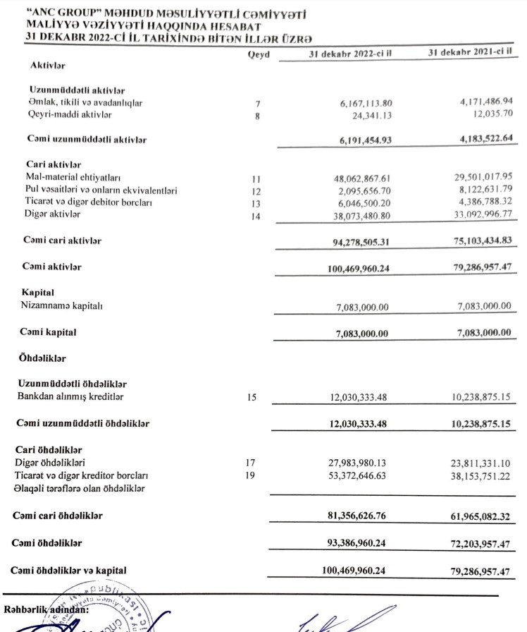 31 Dekabr 2022-ci il tarixində "ANC GROUP" MMC 100 milyon 470 min manat cəmi aktivlərə malik olub. Şirkət 2021-ci ilin sonunda 79 milyon 287 min manat cəmi aktivlərə malik idi (ötən il aktivləri 21 milyon 183 min manat və ya 26,7% artıb ).