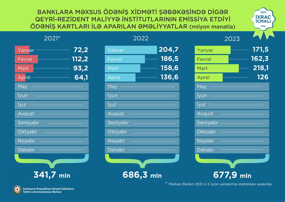 İqtisadi İslahatların Təhlili və Kommunikasiya Mərkəzinin (İİTKM) “İxrac icmalı”nın may sayında bildirilir ki, 2023-cü ilin yanvar-aprel aylarında banklara məxsus ödəniş xidməti şəbəkəsində digər qeyri-rezident maliyyə institutlarının emissiya etdiyi ödəniş kartları ilə 677,9 milyon manat, yalnız aprel ayında isə 126 milyon manat dəyərində əməliyyat aparılıb.