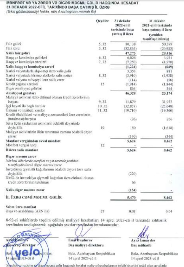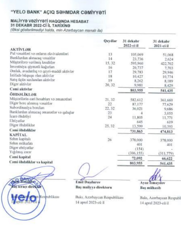 "Yelo Bank" ASC-nin 31 dekabr 2022-ci il tarixində başa çatmış il üzrə Beynəlxalq Maliyyə Hesabatı Standartlarına uyğun hazırlanmış Maliyyə Hesabatlarına görə, Bank 2022-ci ili 5 milyon 624 min manat xalis mənfəət ilə başa vurub. "Yelo Bank" 2021-ci ili 8 milyon 462 min manat xalis mənfəət ilə bağlamışdı.