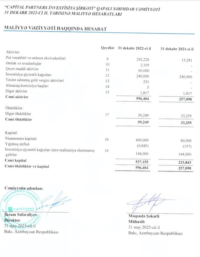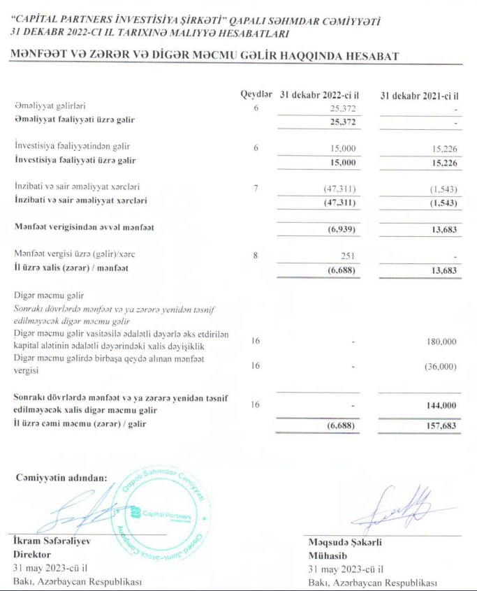 Ötən il "Capital Partners" in investisiya gəlirləri 15 min manat olub. 2021-ci ildə şirkətin investisiya gəliri 15 min 226 manat olmuşdu.