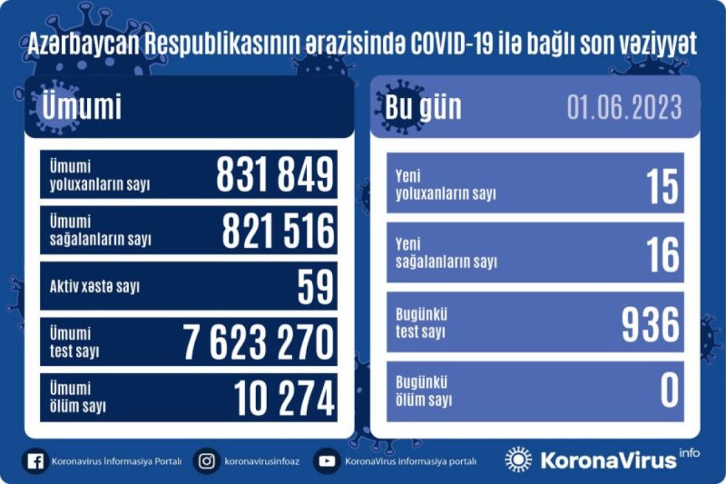 (®) Azərbaycanda koronavirus (COVID-19) infeksiyasına 15 yeni yoluxma faktı qeydə alınıb, 16 nəfər müalicə olunaraq sağalıb.