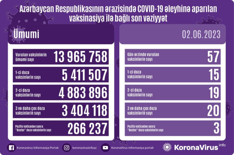 Azərbaycanda son sutkada koronavirus (COVID-19) əleyhinə 57 vaksin vurulub. Bir gündə birinci mərhələ üzrə vaksinasiya olunanların sayı 15, ikinci mərhələ üzrə vaksinasiya olunanların sayı 19, üç və daha çox doza üzrə vaksinasiya olunanların sayı 20, pozitiv nəticədən sonra buster doza üzrə vaksinasiya olunanların sayı 3 nəfərdir.