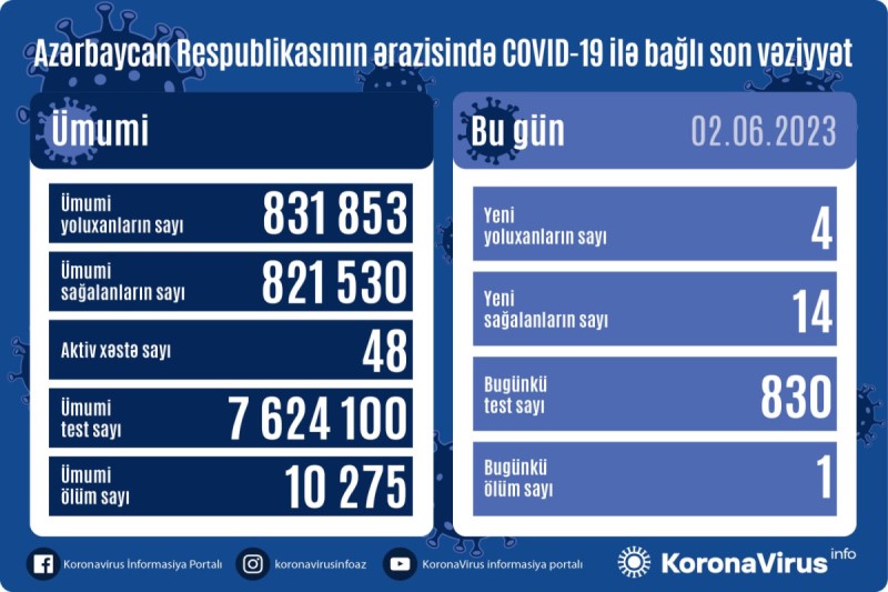 Azərbaycan Respublikasında koronavirus (COVID-19) infeksiyasına 4 yeni yoluxma faktı qeydə alınıb, 14 nəfər müalicə olunaraq sağalıb.