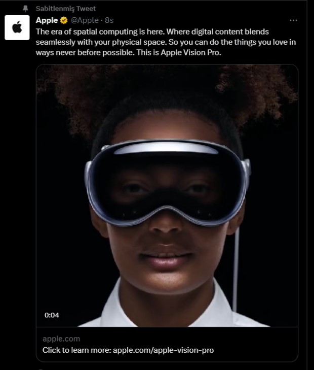 Apple şirkətinin Vision Pro ilə bağlı verdiyi açıqlamada məhsulun şirkətin ilk optik məkan kompüteri (spatial computing) olduğu qeyd edilib.