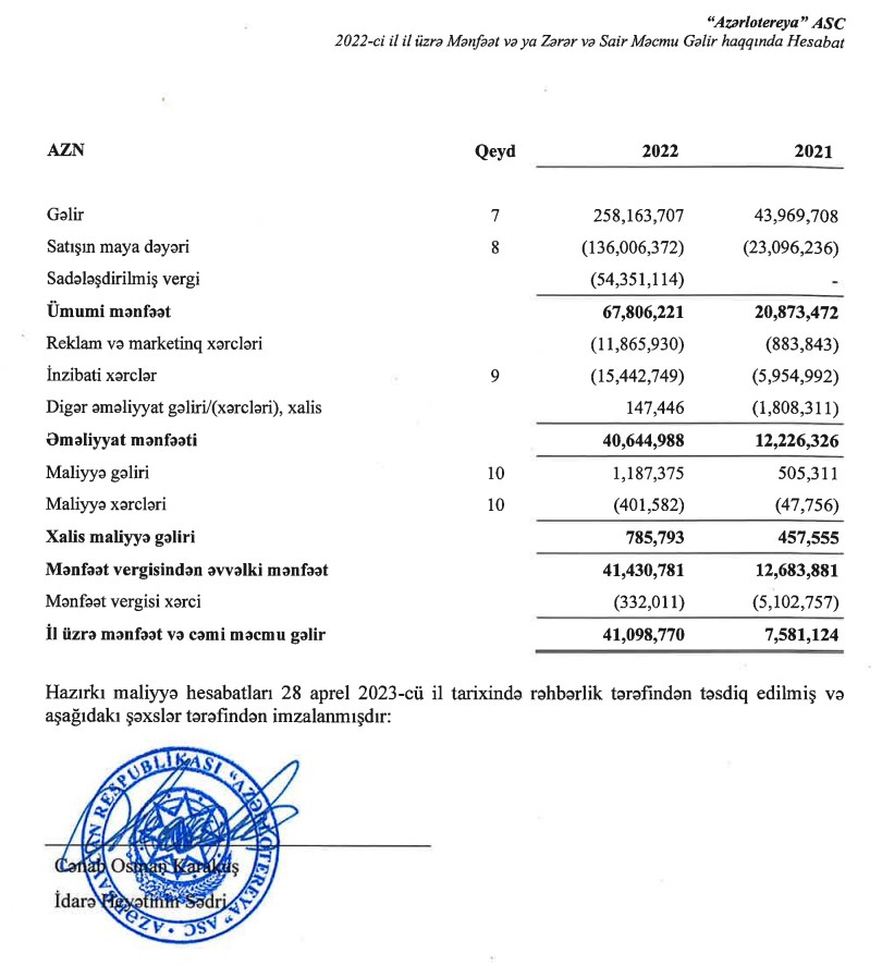 “Azərlotereya” ASC-nin 2022-ci il hesabat dövrünə aid hesablanmış sadələşdirilmiş və mənfəət vergisi məbləği 54.7 milyon manat təşkil edib. 2021-ci ildə mənfəət vergisi ödəyicisi olaraq büdcəyə 5.1 milyon manat mənfəət vergisi ödəmişdir.