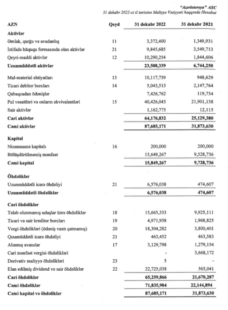 2022-ci il ərzində şirkət 16,8 milyon manat məbləğində investisiya edərək uzunmüddətli aktivlərini 6,7 milyon manatdan 23,5 milyon manata yüksəldib. O cümlədən, “Azərlotereya” ASC-nin 2022-ci ilin sonu cəmi aktivləri 87,7 milyon manat təşkil edib. Şirkətin 2021-ci ilin sonunda cəmi aktivləri 31,9 milyon manat olub.