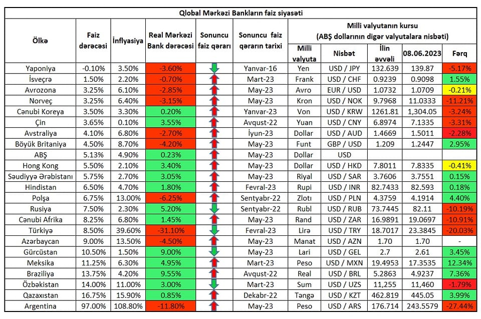 O, qlobal mərkəzi bankların faiz siyasətini, ölkə üzrə inflyasiya göstəricisini və ilin əvvəlində milli valyutanın kursunun dəyişməsini göstərən cədvəl hazırlayıb. Cədvəldə real mərkəzi bank dərəcəsi - Mərkəzi Bankların uçot dərəcəsi ilə inflyasiyanın fərqini əks etdirir.