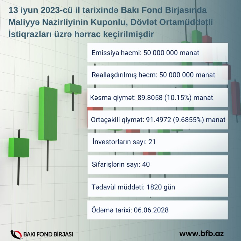 Maliyyə Nazirliyinin istiqrazlarının yerləşdirilməsi üzrə hərrac keçirilmişdir13 iyun 2023-cü il tarixində Bakı Fond Birjasında Azərbaycan Respublikası Maliyyə Nazirliyinin AZ0201040141 ISIN-li, 50 milyon manat həcmində, 1820 gün tədavül müddətli kuponlu, dövlət ortamüddətli istiqrazlarının (DOİ) yerləşdirilməsi üzrə hərrac keçirilib.