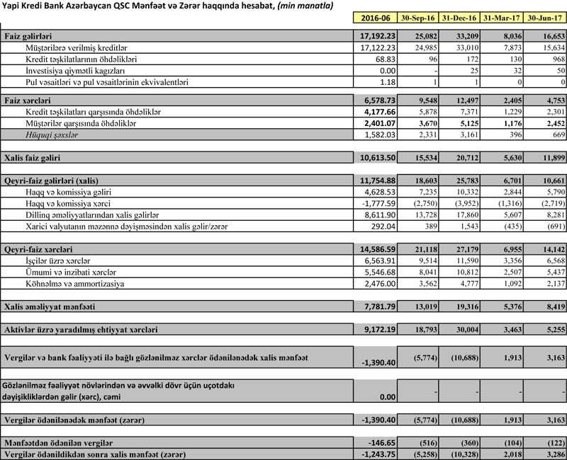 Ötən ilin birinci yarısını 1,2 milyon manat, ili isə 10,3 milyon manat zərər ilə başa vurmuş “Yapi Kredi Bank Azərbaycan”, bu ilin 6 ayında 3,3 milyon manat xalis mənfət əldə edib.