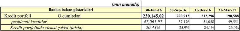 30 İyun 2017-ci il tarixində “Yapi Kredi Bank Azərbaycan” QSC-də problemli kredilər 49,6 milyon manat həcmində olub, bu da kredit portfelinin 26%-nə bərabərdir. Bank verilmiş kreditlər üzrə 56,14 milyon manatlıq ehtiyat yaradıb. Yəni, kreditlər batsa belə, Bank zərər çəkməyəcəkdir.