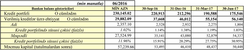 Yanvar-İyun dövründə Bankın müştərilərə verdiyi kreditlər 212,3 milyon manatdan 175,5 milyon manata geriləyib.
