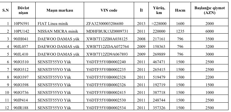 Nəqliyyat vasitələri haqqında ətraflı məlumat və başlanğıc qiyməti aşağıda göstərilib: