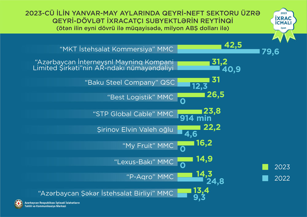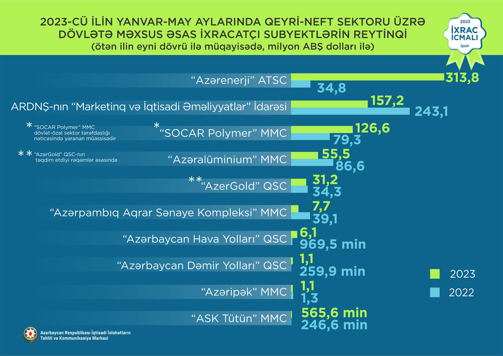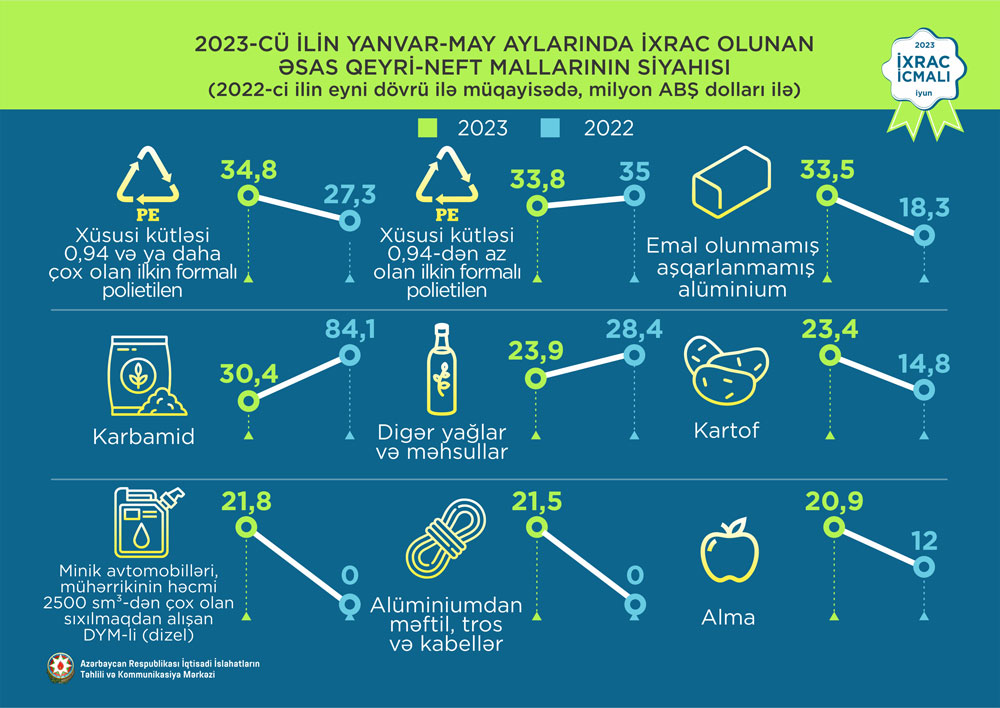 2023-cü ilin yanvar-may ayları ərzində ixrac edilən qeyri-neft sektoruna aid malların siyahısında elektrik enerjisi (313,9 milyon ABŞ dolları) birinci olub. Bu siyahıda pomidor (tomat) (91,5 milyon ABŞ dolları) ikinci, ilkin formalı polipropilen (57,2 milyon ABŞ dolları) isə üçüncü yerdə qərarlaşıb.