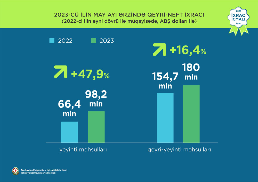 İqtisadi İslahatların Təhlili və Kommunikasiya Mərkəzinin (İİTKM) təqdim etdiyi “İxrac icmalı”nın iyun sayına əsasən, 2023-cü ilin yanvar-may ayları ərzində Azərbaycanın ümumi ixracı 16,1 milyard ABŞ dolları, qeyri-neft sektoru üzrə ixrac 1,5 mlrd. ABŞ dolları təşkil edib. Qeyri-neft sektoru üzrə ixrac 2022-ci ilin müvafiq dövrü ilə müqayisədə 22,1% artıb. 2023-cü ilin yanvar-may ayları ərzində yeyinti məhsulları üzrə ixrac 334,4 milyon ABŞ dollarına bərabər olub.