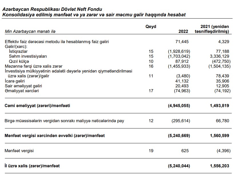 Ümumilikdə, ARDNF 2022-ci ili 5 milyard 240 milyon manat xalis zərər ilə başa vurub. Fond 2021-ci ili 1 milyard 556 milyon manat xalis mənfəət ilə bağlamışdı. Fond istiqrazlara investisiyalar üzrə 1 milyard 929 milyon manat, səhm investisiyaları üzrə 1 milyard 703 milyon manat, məzənnə fərqi üzrə 1 milyard 456 milyon manat itirmiş, qızıl külçə üzrə 87 milyon 912 min manat qazanmışdı.