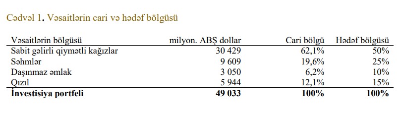 2022-ci il ərzində aktivlərin bazar dəyərində qısamüddətli qiymət dəyişkənliyi səbəbindən ARDNF-nin vəsaitlərinin idarə edilməsindən 2 milyard 461,3 milyon ABŞ dolları (4 milyard 184,21 milyon manat) azalma müşahidə olunmuşdur. Hesabat ilində ARDNF-nin investisiya portfelinin gəlirliliyi -5,2% təşkil etmişdir. Buna Azərbaycanın Neft Fondunun aldığı istiqraz və səhmlərin ucuzlaşması səbəb olub.Azərbaycan Respublikası Dövlət Neft Fondunun (ARDNF) ötən il 45,03 milyard ABŞ dollarına bərabər aktivləri 2022-ci ilin sonuna artaraq 49,03 milyard ABŞ dollarına yüksəlmişdir. Ümumi portfelin 62,1% və ya 30,4 milyard ABŞ dolları hissəsi borc öhdəlikləri və pul bazarları alətlərinə, 19,6% və ya 9,6 milyard ABŞ dolları hissəsi isə səhmlərə investisiya edilmişdir. Portfelin 6,2% və ya 3,1 milyard ABŞ dolları hissəsini daşınmaz əmlak, qalan 12,1% və ya 5,9 milyard ABŞ dolları hissəsini isə qızıl investisiyaları təşkil etmişdir.