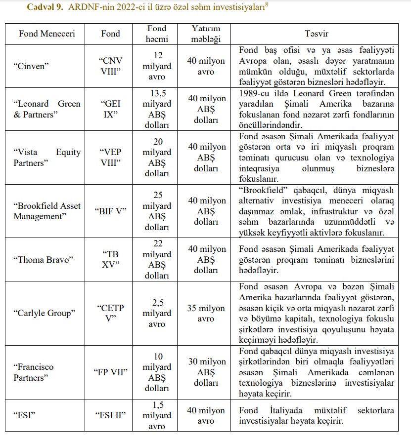 2022-ci ildə ARDNF 11 fond və 2 müştərək investisiyaya kapital qoyuluşu etmişdir. Aşağıda həmin investisiyalar haqda qısa məlumat əks olunmuşdur: