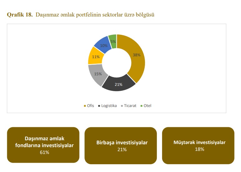 Dinamik bazar dəyişikliklərinə uyğunlaşmaq üçün ofis, ticarət, yaşayış, otel və logistika kimi ənənəvi daşınmaz əmlak növləri ilə yanaşı, cari daşınmaz əmlak portfeli tibbi laboratoriyalar, data mərkəzləri və tələbə yataqxanaları kimi taktiki və bazara əsaslanan alternativ daşınmaz əmlak növlərini əhatə edir. Bu günədək biz 30-dan çox ölkədə 17 etibarlı tərəfdaşla 6 birbaşa, 13 müştərək, 31 daşınmaz əmlak fondları vasitəsilə olmaqla ümumilikdə 50 investisiya həyata keçirmişik. Portfel regionlara və risk profillərinə görə yüksək diversifikasiya olunmuşdur. Daşınmaz əmlak fondlarına edilmiş investisiyalar ümumi daşınmaz əmlak portfelinin 61%-ni təşkil edir.
