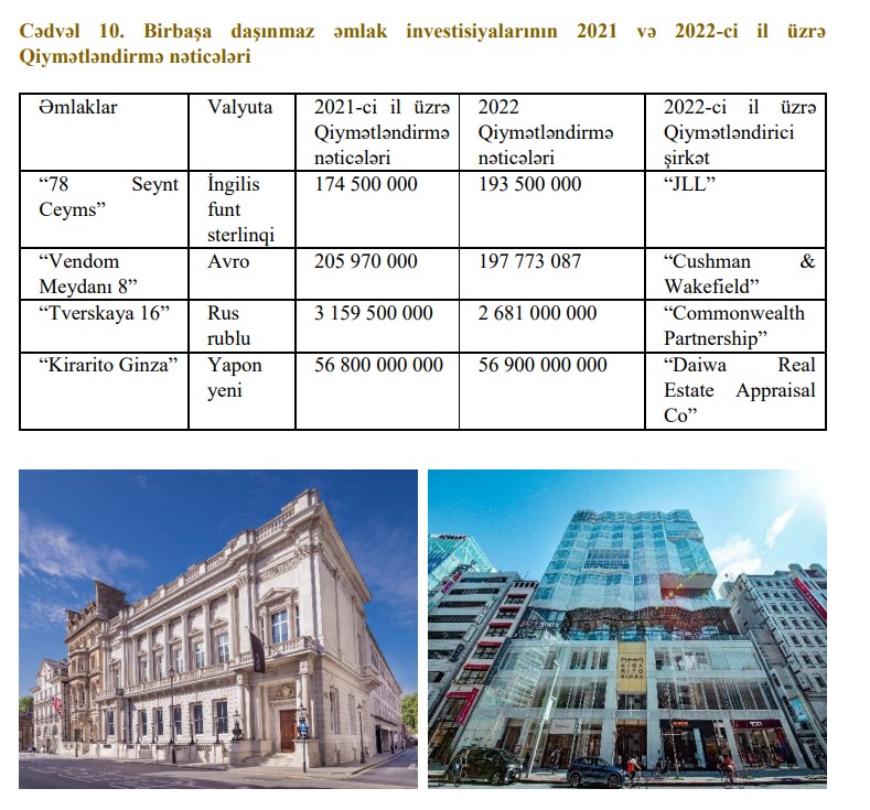 "Daşınmaz əmlaka birbaşa investisiyalar Birbaşa investisiyalar Moskva, London, Paris və Tokio şəhərlərində yerləşən dörd əmlak olmaqla bizim daşınmaz əmlak portfelimizin 21%-ni təşkil edir. Hər bir əmlakımız illik əsasda müstəqil olaraq qiymətləndirilir. Aşağıdakı cədvəldə birbaşa investisiya etdiyimiz daşınmaz əmlakların 2021 və 2022-ci illər üzrə qiymətləndirmə nəticələri və müvafiq qiymətləndirici şirkətlər qeyd olunmuşdur".