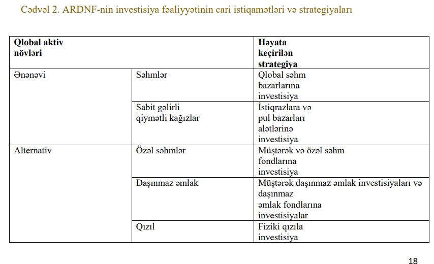 Hesabatda bildirilir ki, ARDNF-nin investisiya strategiyasının əsasını irihəcmli itkilərin minimuma endirilməsi şərti ilə maksimal gəlirliliyin əldə edilməsi təşkil edir. Portfelin maliyyə alətləri və ölkələr üzrə geniş diversifikasiyası, eləcə də, makroiqtisadi mühitin daimi təhlili bu məqsədə nail olmağa və investisiya portfelinin stabil gəlirliliyinin təmin edilməsinə xidmət edən amillərdəndir.