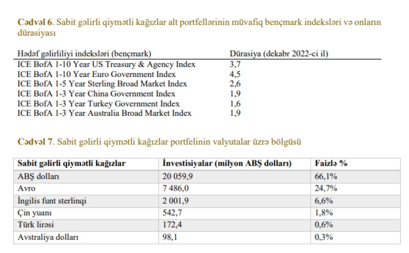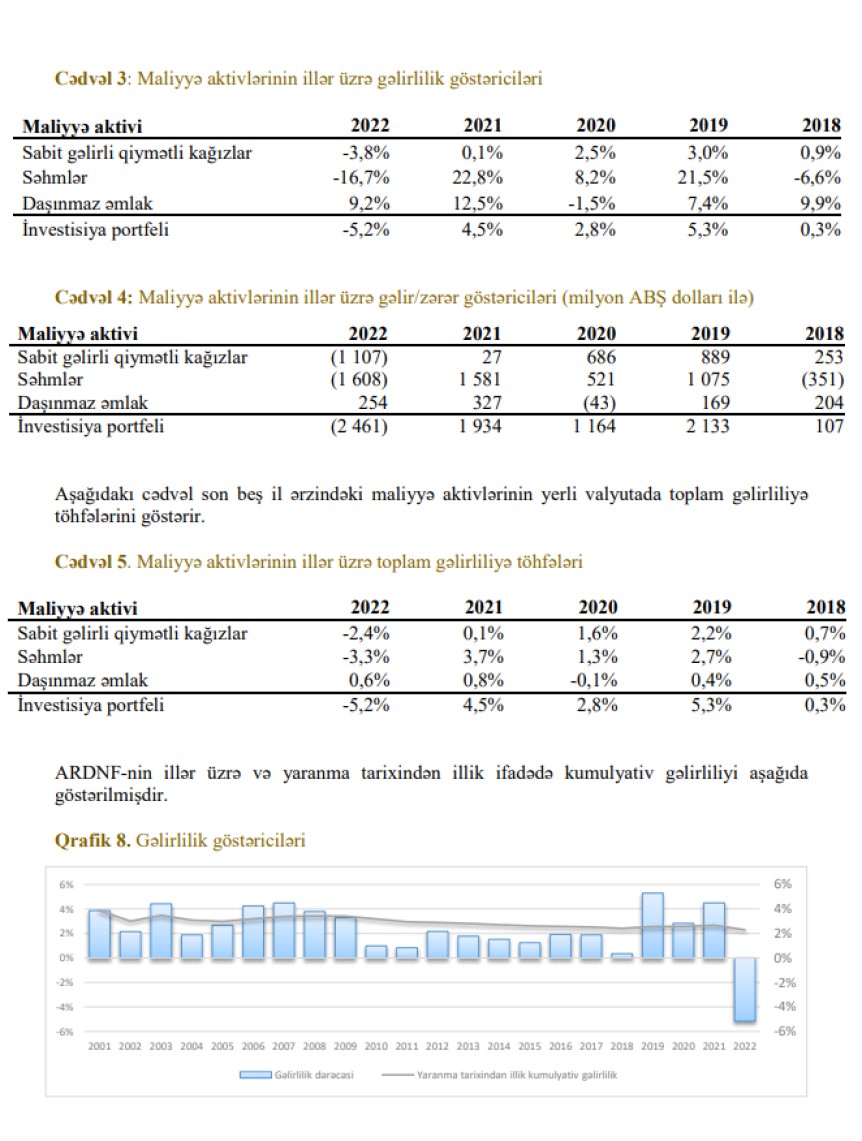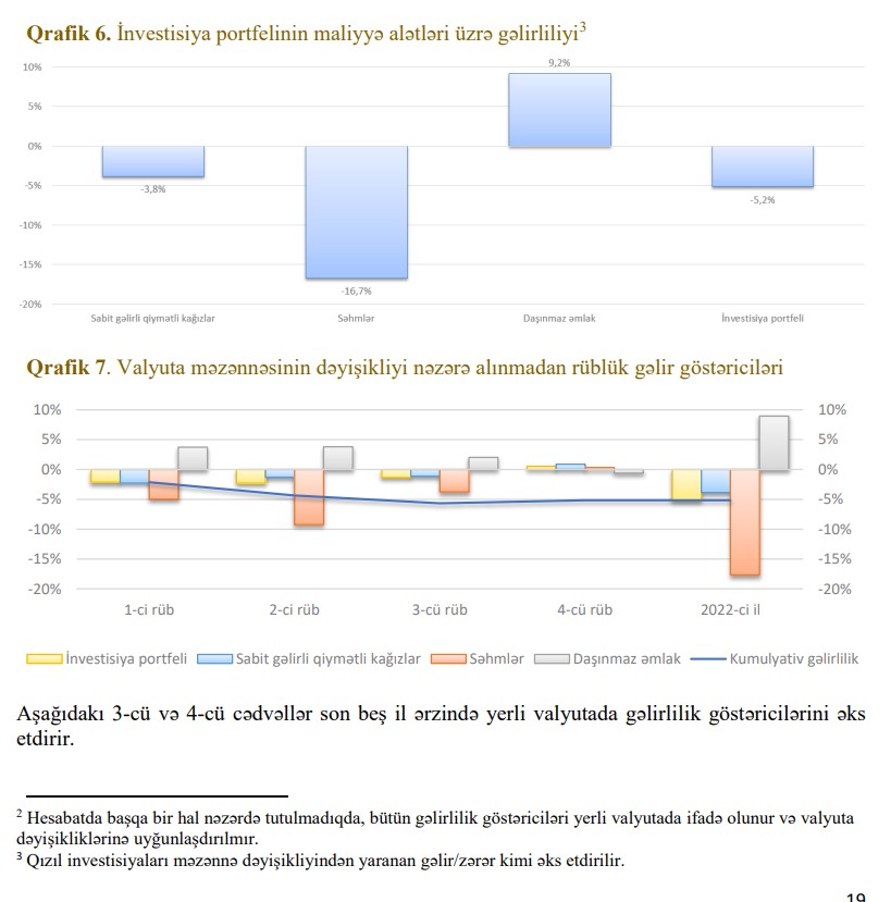 Hesabatda bildirilir ki, ötən il Fondun investisiya gəlirləri olmayıb, əksinə investisiyaları üzrə 2 milyard 461,3 milyon ABŞ dolları (4 milyard 184,21 milyon manat) itki ilə üzləşib. Qeyd edilib ki, 2022-ci ildə ARDNF-nin sabit gəlirli qiymətli kağızlara investisiyalarının gəlirliliyi mənfi (-) 3,8% təşkil etmişdir. Faizlərin ilkin səviyyələrinin aşağı olması və onların qlobal maliyyə böhranından bəri görünməmiş həddə artımı istiqrazların böyük dəyər itirməsinə səbəb olmuşdur.