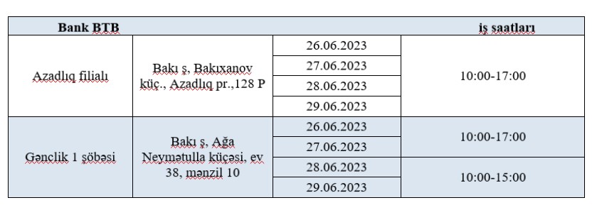 Bank BTB əhalinin bank xidmətlərindən rahat və səmərəli istifadə etməsini təmin etmək məqsədilə 26, 27, 28 və 29 iyun 2023-cü il tarixlərində xüsusi rejimdə fəaliyyət göstərəcək.