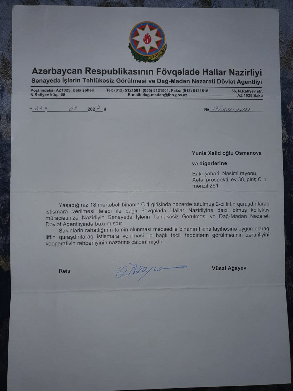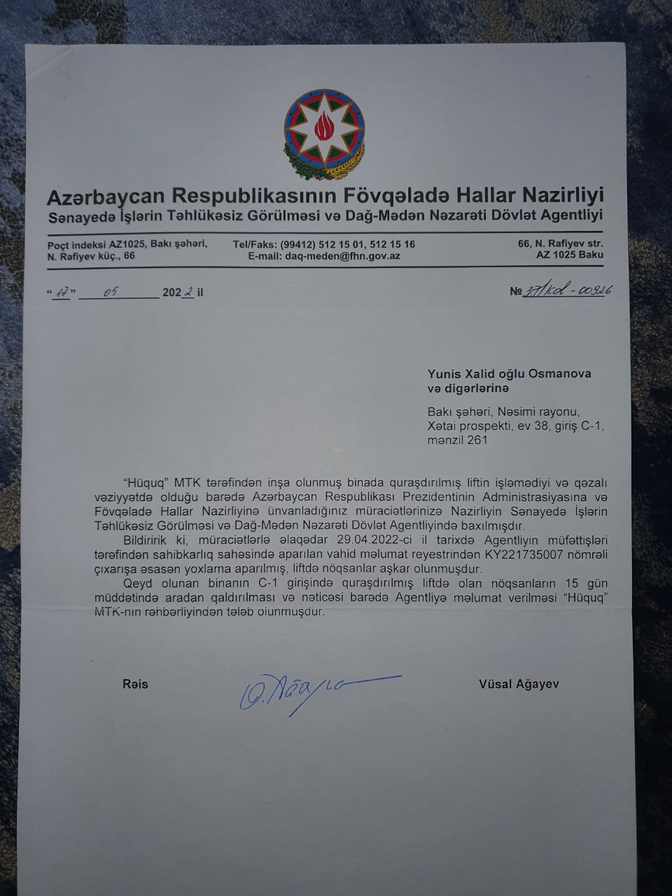 2022-ci ildə Osmanov Yunisin müraciətlərinə Azərbaycan Respublikası Fövqəladə Hallar Nazirliyinin Sənayedə İşlərin Təhlükəsiz Görülməsi və Dağ-mədən Nəzarəti Dövlət Agentliyindən verilən cavablarda bildirilir ki, həqiqətən "Hüquq" MKT tərəfindən inşa edilmiş binanın C1 girişində 2-ci liftin istismara verilmədiyi, qüsurlar olduğu aşkar edilib. Agentlik tərəfindən 15 gün ərzində nöqsanın aradan qaldırılması və liftin istismara verilməsi barədə "Hüquq" MKT-nın rəhbərliyindən tələb olunub.Həmin tələblərdən xeyli vaxt keçməsinə baxmayaraq "Hüquq" MKT liftin istifadəyə verilməsini təmin etməyib.