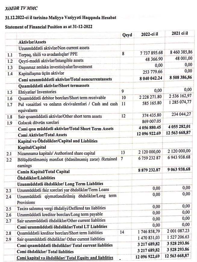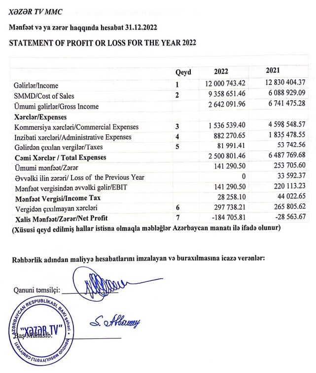"Xəzər TV" MMC 2022-ci ili 184 min 705 manat xalis zərər ilə başa vurub. MMC 2021-ci ili 28 min 563 manat xalis zərər ilə bağlamışdı. Beləliklə, ötən il TV şirkətinin xalis zərəri 6,6 dəfə artıb.
