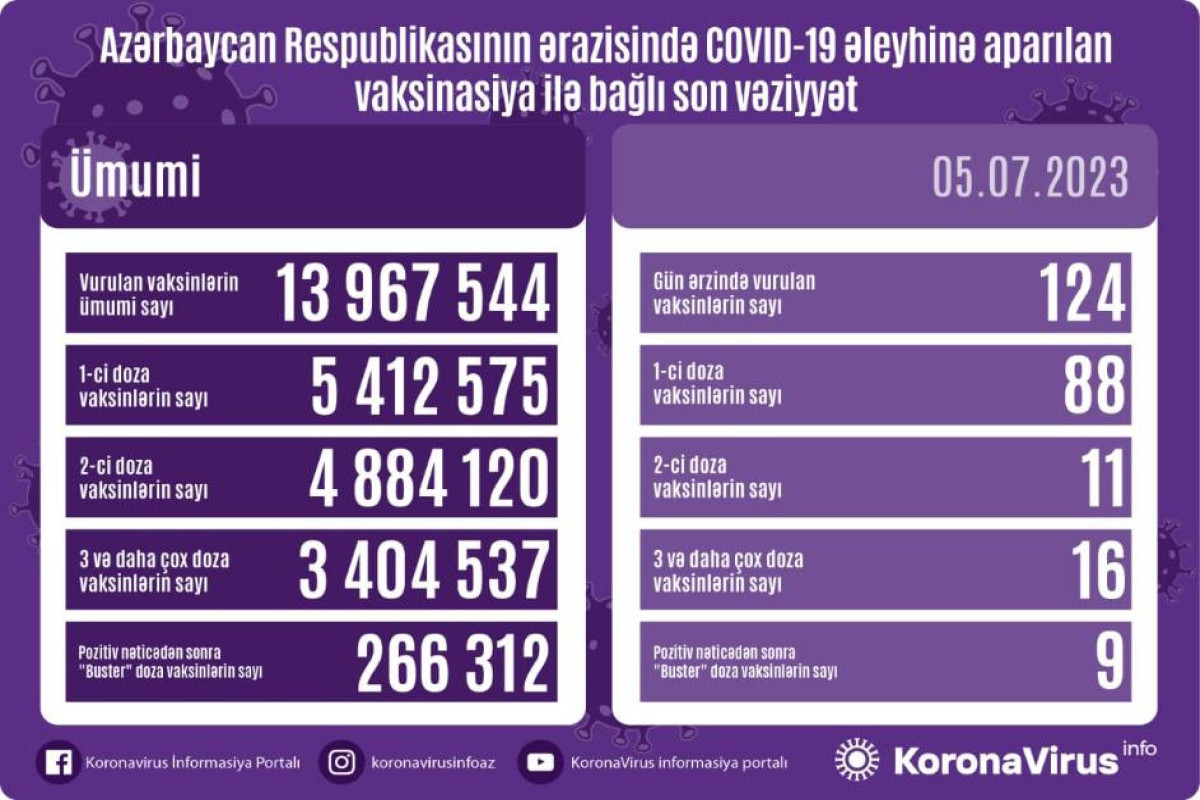 Azərbaycanda son sutkada koronavirus (COVID-19) əleyhinə 124 vaksin vurulub.