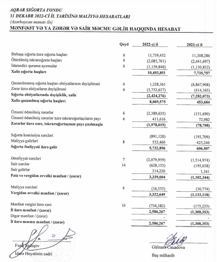 Aqrar Sığorta Fondu 2022-ci ili 2 milyon 586 min manat xalis mənfəət ilə başa vurub. Fond 2021-ci ili 1 miylon 308 min manat xalis zərər ilə bağlamışdı.