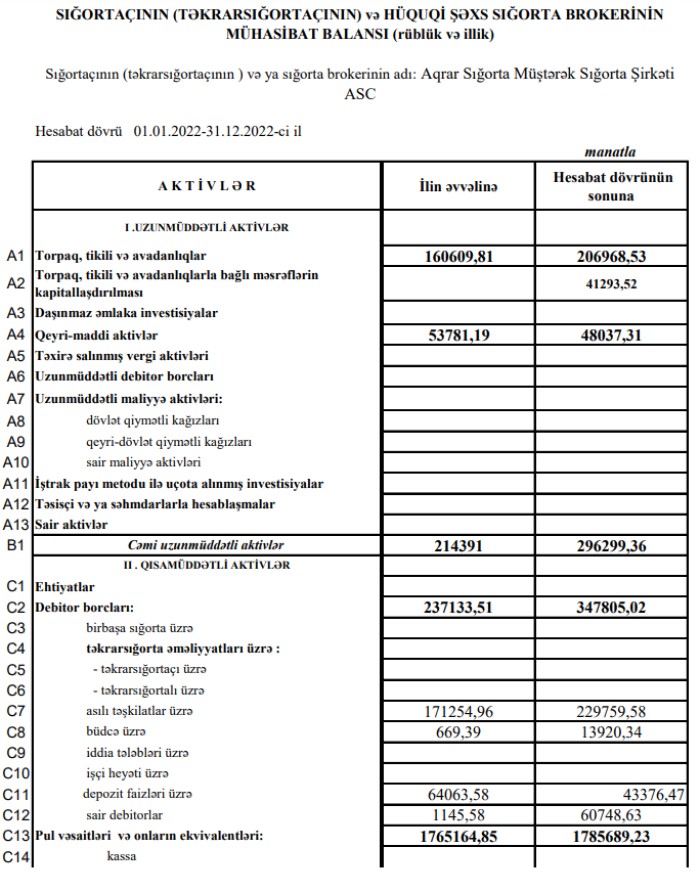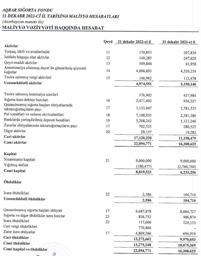 Aqrar Sığorta Fondu 31 dekabr 2022-ci il tarixində 22 milyon 95 min manat cəmi aktivlərə malik olub (2021-ci ilin sonunda 16 milyon 309 min manat).