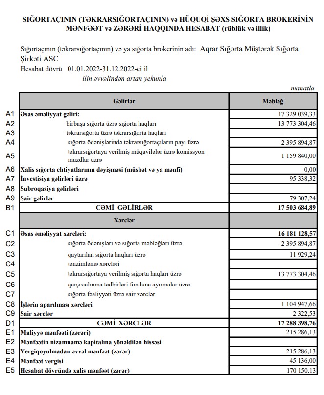 Fondu idarə edən qurum olan "Aqrar Sığorta Müştərək Sığorta Şirkəti" ASC isə 2022-ci ili 170 min 150 manat xalis mənfəət ilə başa vurub. Ötən il şirkətin cəmi gəlirləri 17 milyon 504 min manat, cəmi xərcləri 17 milyon 288 min manat olub.