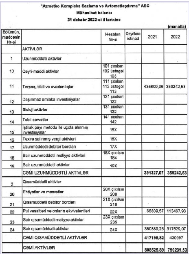 "Azmetko Kompleks Sazlama və Avtomatlaşdırma" ASC 31 dekabr 2022-ci il tarixində 790 min manat cəmi aktivlərə malik olub. Şirkət 2021-ci ilin sonunda 808 min manat cəmi aktivlərə malik idi.