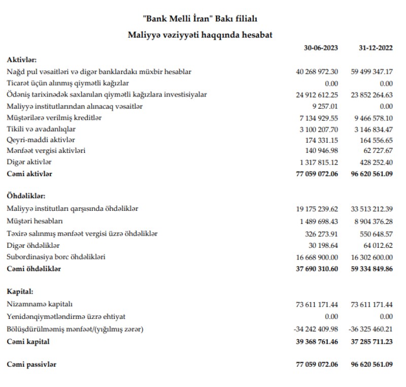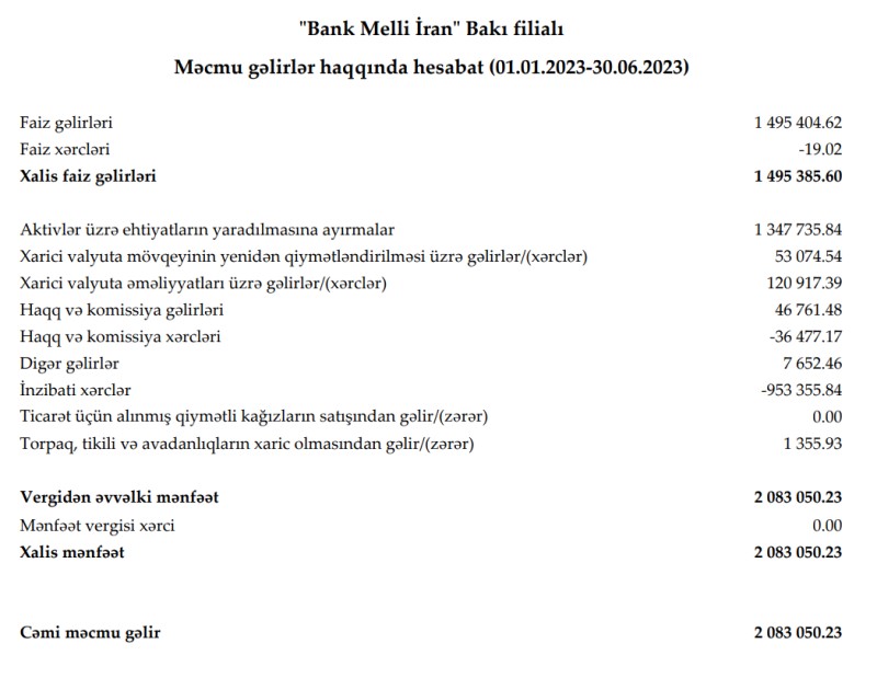 "Bank Melli İran" Bakı filialı 2023-cü ilin ilk yarısını (yanvar-iyun) 2 milyon 83 min manat xalis mənfəət ilə başa vurub. Filial 2022-ci ilin ilk yarısını 806 min manat xalis mənfəət ilə bağlamışdı. Beləliklə, 2023-cü ilin ilk yarısında "Bank Melli İran" Bakı filialının xalis mənfəəti 2,6 dəfə artıb. Xalis mənfəətin artması Bankın cari biznes fəaliyyətindən qaynaqlanmır.
