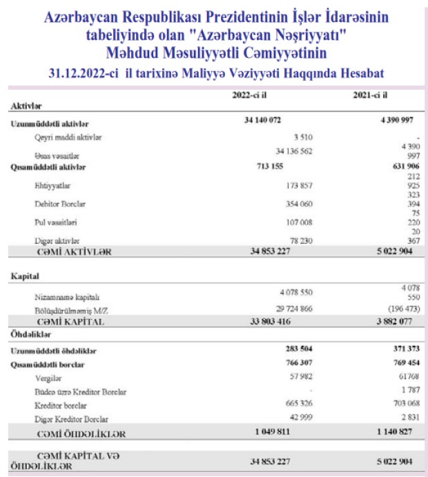 "Azərbaycan Nəşiriyyatı" MMC 2022-ci ilin sonunda 34 milyon 853 min manat cəmi aktivlərə malik olub ki, bu da 2021-ci ilin sonu ilə müqayisədə 7 dəfə çoxdur.