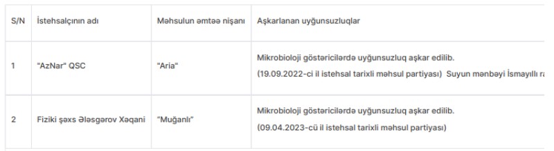 Sınaq nəticələrinə əsasən, nümunələrdən 22-nin nəticəsi qənaətbəxş olub. 4 nümunənin mikrobioloji göstəriciləri qida sahəsində normativ sənədlərin tələblərinə cavab verməyib. Sınaq nəticəsi uyğunsuz çıxan suların adları aşağıda (Cədvəl 1) qeyd olunan emal müəssisələrində yoxlama keçirilib, hər 4 müəssisənin su emalı fəaliyyəti dayandırılıb, uyğunsuz çıxan məhsul partiyasının istehlakçılardan, bazardan və digər satış obyektlərindən geri çağırılması barədə icrası məcburi göstəriş verilib, 16 300 ədəd 1 litrlik, 817 ədəd 5 litrlik, 672 ədəd 0.5 litrlik su məhsulları isə geri qaytarılaraq məhv edilib.
