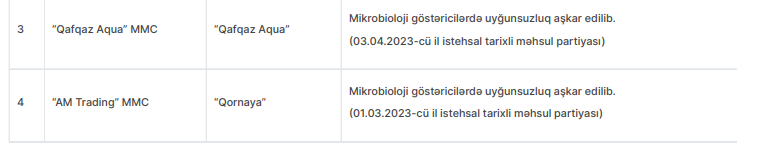 Mikrobioloji göstəricilərində uyğunsuzluq aşkar edilən 4 müəssisə və həmin müəssisələrdə emal olunan məhsullar, həmçinin görülən tədbirlərlə aşağıdakı cədvəl vasitəsilə tanış ola bilərsiniz: