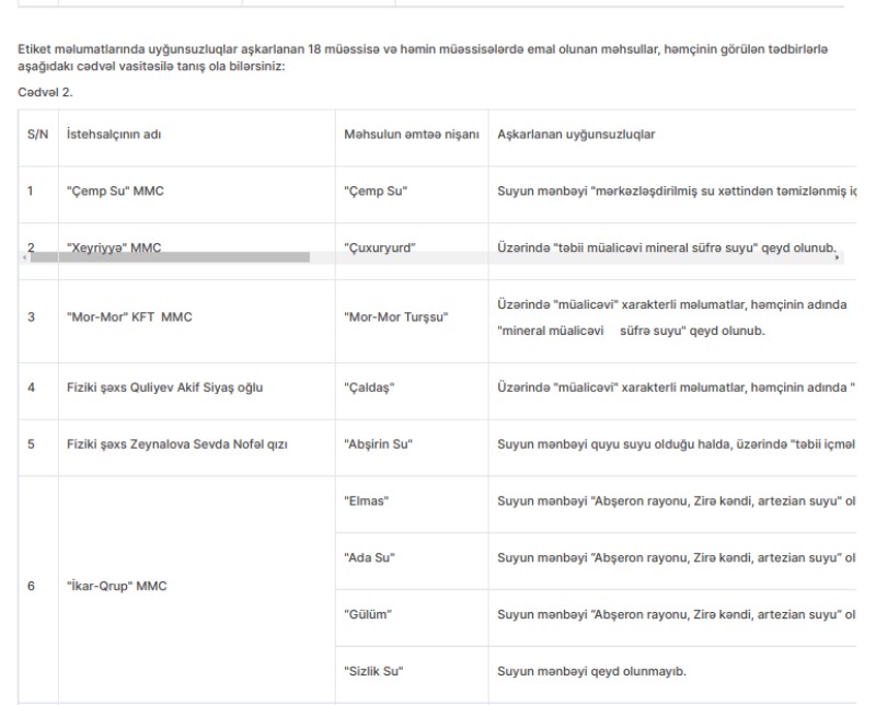Belə ki, emal edilmiş suların etiketlənməsinin qanunvericiliyin tələblərinə uyğun olmadığı, bəzi məhsullarda suların mənbəyinin göstərilmədiyi, bir çox hallarda isə mərkəzləşdirilmiş su sistemindən gələn sular (əhaliyə verilən sular), həmçinin artezian suları qablaşdırıldığı halda, məhsulun üzərində həmin suların müxtəlif təbii mənbələrdən, dağlardan və bulaqlardan gətirilərək qablaşdırıldığı, o cümlədən məhsulun etiketində dağların, bulaqların təsvirlərinin və müxtəlif coğrafi adların qeyd edildiyi müəyyən olunub. Bu da məhsulun üzərində qida məhsullarına xas olmayan təsir və ya xassələrin göstərilməsinə, nəticədə qanunvericiliyə zidd olaraq istehlakçıların aldadılmasına səbəb olur. Həmçinin bəzi suların etiketində həmin məhsulun insan xəstəliklərinin qarşısını alması, müalicəvi xüsusiyyətlərə malik olması haqqında məlumatların qeyd olunduğu müəyyən edilib (Cədvəl 2).