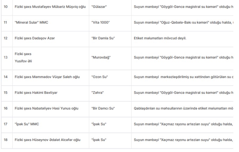 Yoxlamalar zamanı 18 müəssisədə qida sahəsində qanunvericiliyin tələblərinin pozulması halları müəyyən olunub.Azərbaycan Respublikasının Qida Təhlükəsizliyi Agentliyi (AQTA) qida təhlükəsizliyinin təmin edilməsi və istehlakçı hüquqlarının müdafiəsi məqsədilə ölkədə emal olunan qablaşdırılmış içməli sularla bağlı nəzarət tədbirlərini davam etdirir.