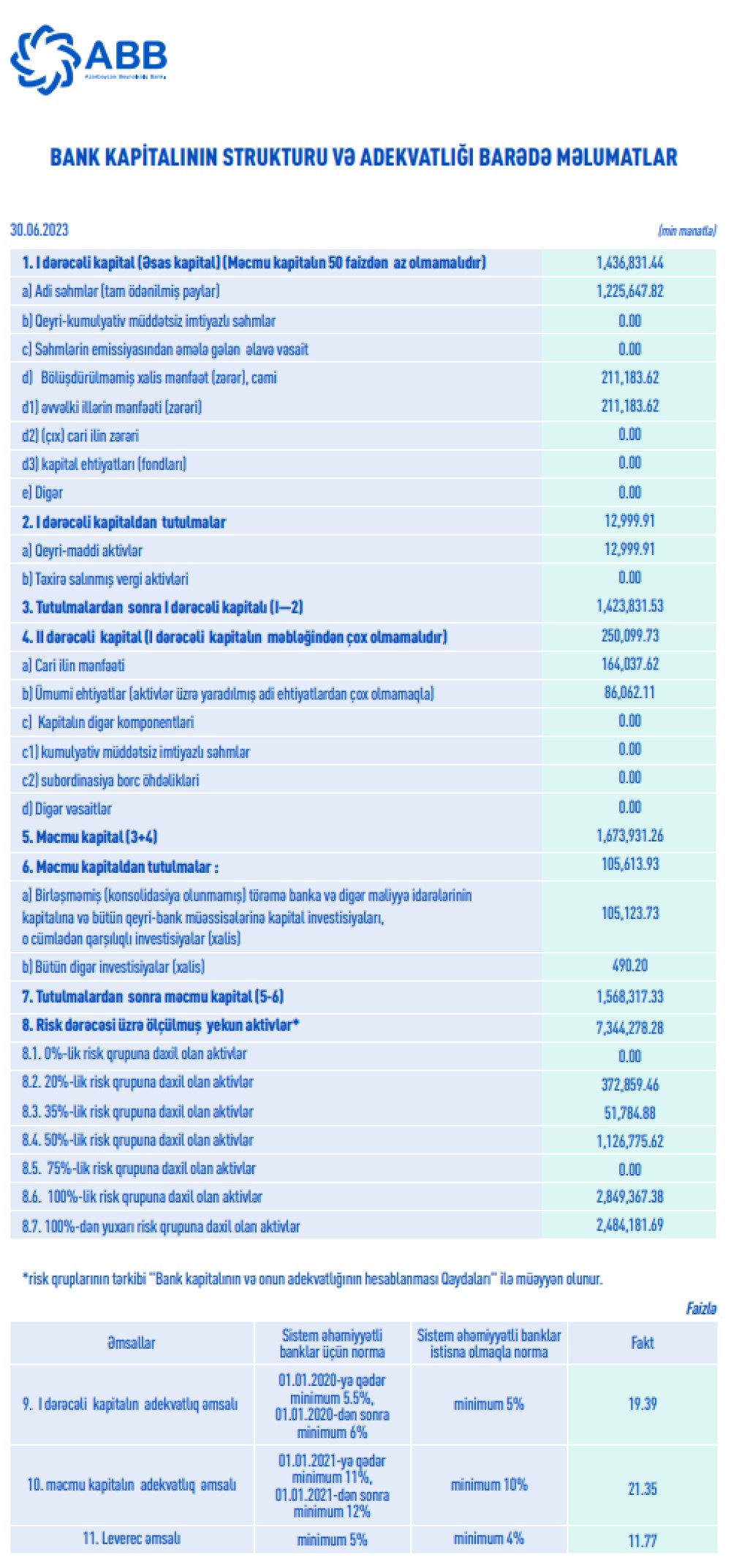 30 iyun 2023-cü il tarixində ABB 1 milyard 568 milyon 317 min manat məcmu kapitala malik olub. Yarım il ərzində ABB-nin I dərəcəli kapitalının adekvatlıq əmsalı 19.39%, məcmu kapitalının adekvatlıq əmsalı 21.35% təşkil edib. Beləliklə, Bankın kapital adekvatlığı göstəriciləri tənzimləyici orqanın müəyyən etdiyi normalardan (müvafiq olaraq sistem əhəmiyyətli banklar üçün 6% və 12%) yüksək qalmaqdadır.