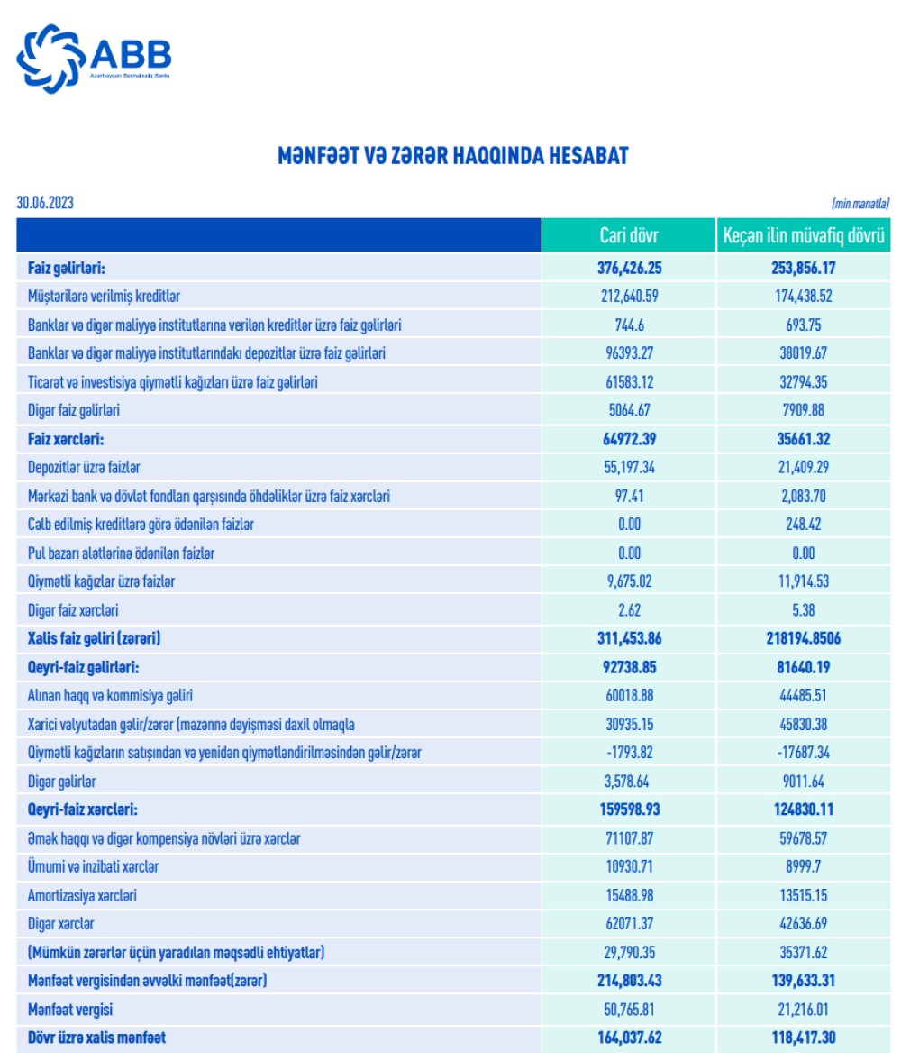 Bank 157 milyon manat dividend ödəyir"ABB" ASC (Azərbaycan Beynəlxalq Bankı) 2023-cü ilin ilk 6 ayını (yanvar-iyun) 164 milyon 38 min manat xalis mənfəətlə başa vurub. Bank ötən ilin eyni dövrünü 118 milyon 417 min manat xalis mənfəətlə bağlamışdı. Beləliklə, ABB-nin xalis mənfəəti 2023-cü ilin ilk 6 ayında ötən ilin ilk 6 ayı ilə müqayisədə 45 milyon 620 min manat və ya 38,5% artıb. Xalis mənfəətin artması əsasən faiz gəlirlərinin artmasından qaynaqlanır.