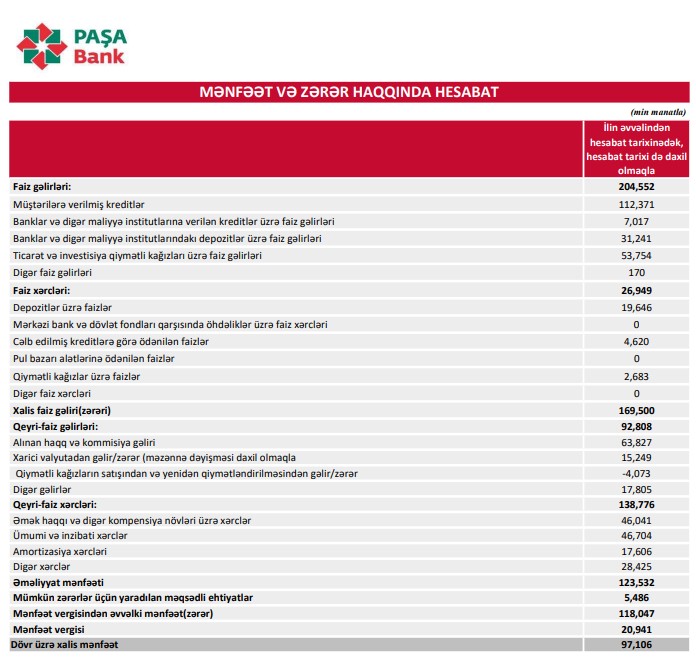 "PAŞA Bank" əməliyyat mənfəəti 31,8% artaraq 123 milyon 532 min manat olub.