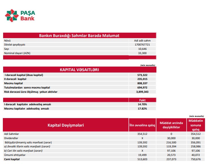 30 İyun 2023-cü il tarixində "PAŞA Bank" 694 milyon 972 min manat məcmu kapitala malik olub.