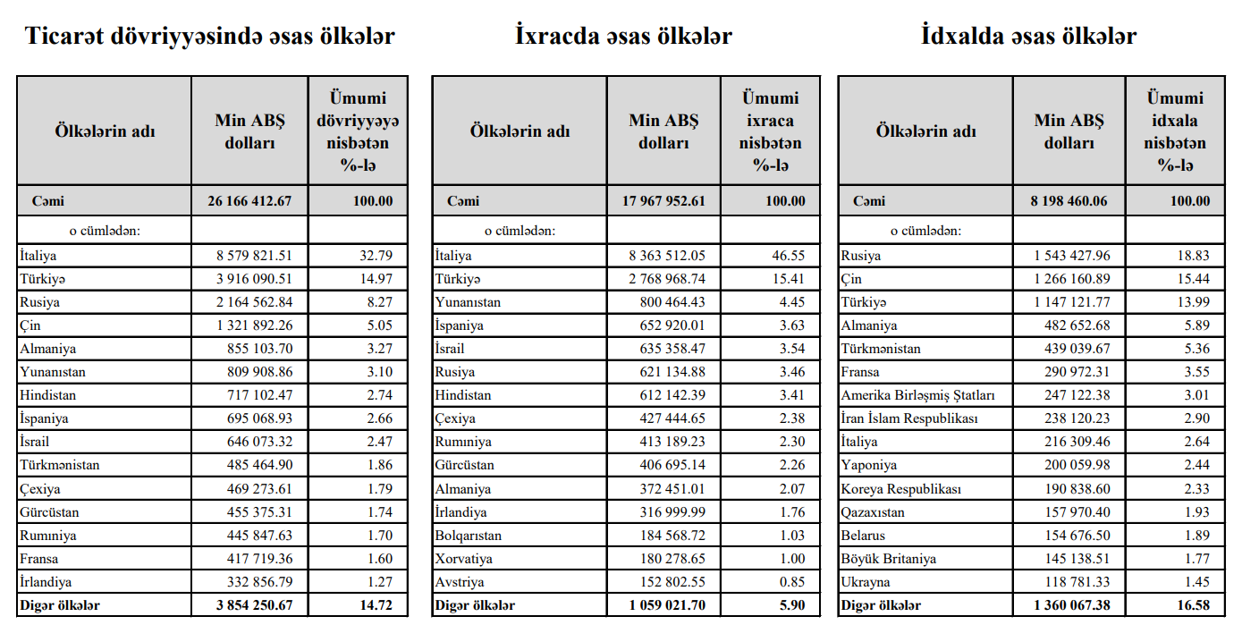 Azərbaycan malları ən çox Rusiya, Çin və Türkiyədən alır, İtaliya, Türkiyə və Yunanıstana isə satır.