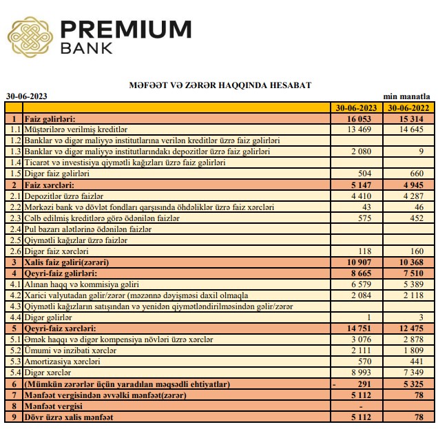 2023-cü ilin birinci yarısında "Premium Bank"ən cəmi əməliyyat gəlirləri 24 milyon 718 min manat, cəmi əməliyyat xərcləri 19 milyon 898 min manat, əməliyyat mənfəəti 4 milyon 820 min manat olub. Mümkün zərərlər üçün yaradılan məqsədli ehtiyatlardan azad olmuş 291 min manatın hesabına mənfəət 5 milyon 112 min manata yüksəlib. Müqayisə üçün qeyd edək ki, 2022-ci ilin birinci yarısında "Premium Bank"ın cəmi əməliyyat gəlirləri 22 milyon 824 min manat, cəmi əməliyyat xərcləri 17 milyon 420 min manat, əməliyyat mənfəəti 5 milyon 404 min manat təşkil etmişdi. Bank əməliyyat mənfəətinin 5 milyon 325 min manatını mümkün zərərlər üçün yaradılan məqsədli ehtiyatlara ayırmışdı.